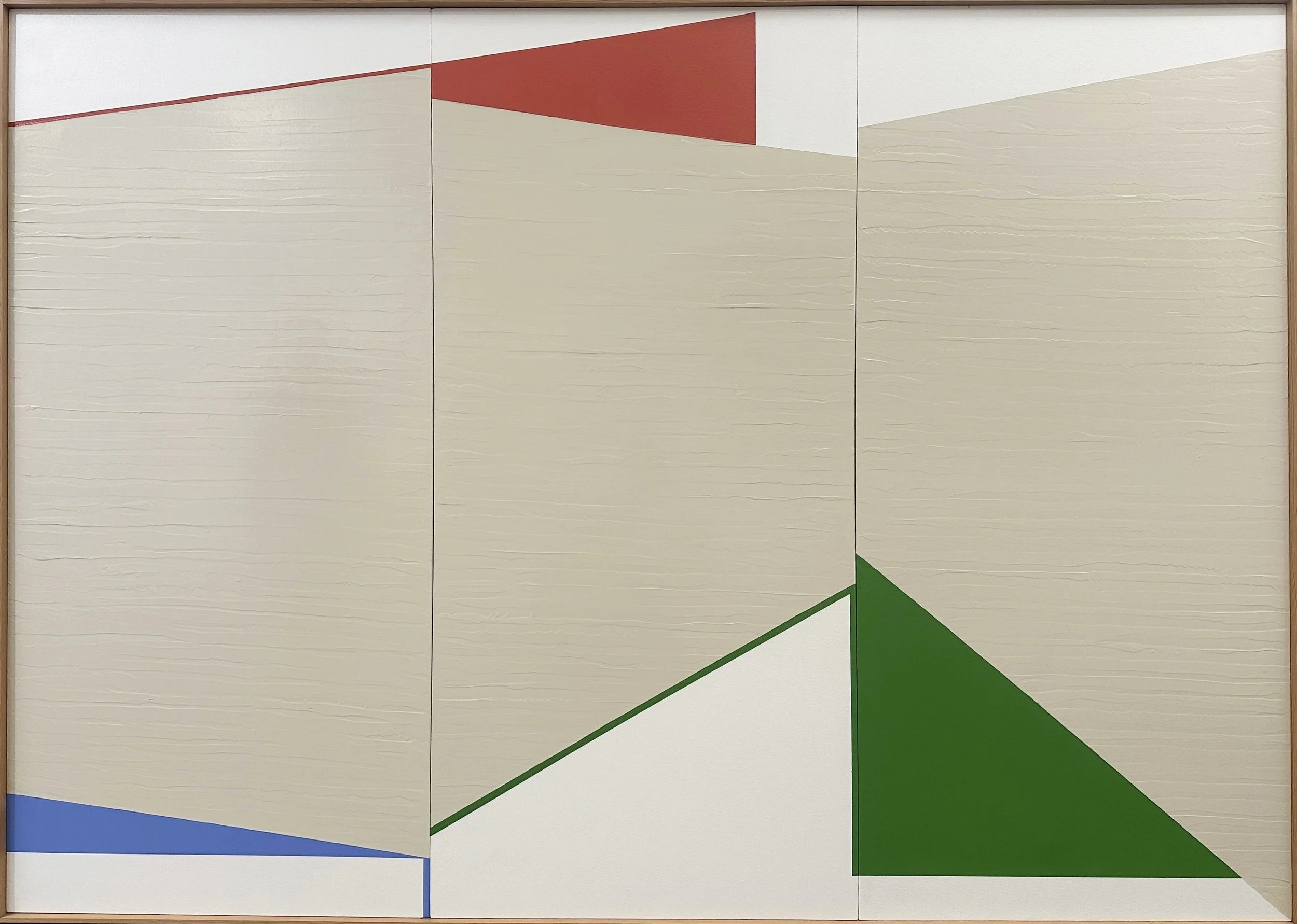 Jason Trotter's work explores the relationship between color and form. Rendered in acrylics, they depict abstract compositions spread across three joined canvases. The Los Angeles based artist is drawn to the multi-canvas approach where the interplay between panels enables simple shapes to unite, resulting in bolder, more visually-compelling compositions: the whole is greater than the sum of its parts. Trotter employs a hard-edge painting technique that produces sharp lines with abrupt transitions between color areas. His rectilinear compositions, inspired by lines and forms observed in daily life, emerge from sketches that are complete once they settle into balanced structures that exude spatial unity. Trotter works on a flat surface, first executing the process of taping off the shapes then building up several layers of paint with his brush before applying the final layer with palette knives and other tools for ample texture. While his earlier work centered on achieving a balance between color and form, his recent explorations - from the new series INTERACTION - are guided by a deeper inquiry into the perception of these elements and how they interact. No longer monochromatic, the new works are layered with multiple color fields, creating a nuanced visual experience for the viewer.